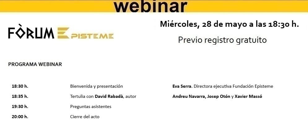 El dimecres, 28 de maig: Tertúlia amb David Rabadà, autor de La educación basurizada. El cáncer de las pseudociencias en educación (Dobleuve). Participen els docents i escriptors, Andreu Navarra, Josep Otón i Xavier Massó. La cita, en Fòrum Episteme, començarà a les 18.30 hores.