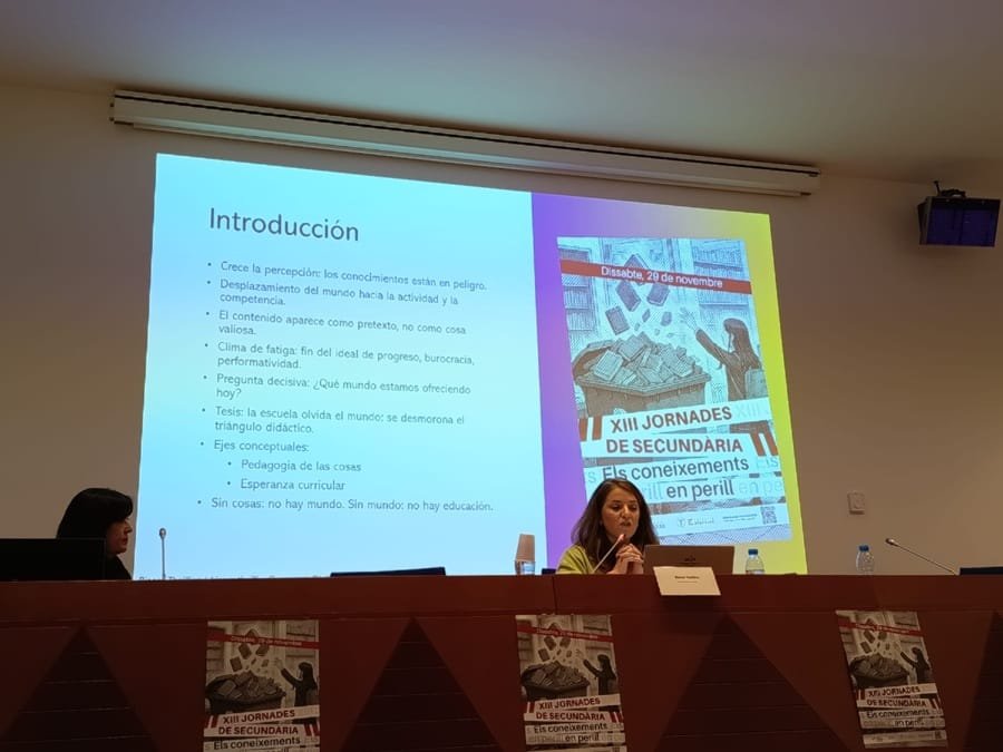 Especialment grata ha estat la ponència de la professora de Teoria de l’Educació de la Universitat Autònoma de Madrid Bianca Thoilliez qui, recuperant la veu de Hannah Arendt i el seu Amor Mundi, ens alerta del perill que l’escola, desposseïda de continguts per ensenyar, deixi d’exercir la responsabilitat adulta sobre el món que li ofereix a l’alumne, a qui, més que conèixer, avui se li demana que actuï, convertint les coses en instruments per a la seva llibertat, que ja no troba l’opacitat ni la resistència que aquelles li oferien, tot despertant la curiositat que estimulava l’enteniment i revaloritzava el món, dotant-lo de sentit, sinó que el desmaterialitza fins fer-lo desaparèixer, transmutat en una realitat virtual d’addiccions i desitjos, a major glòria de l’ego de l’alumne híper-protegit i sobre-conservat. En desterrar el coneixement de les coses del triangle didàctic que caracteritzava tradicionalment l’escola, i en reduir la transmissió a una relació biunívoca entre professor i alumne, que situa a aquest últim en el centre de la interacció -demanant-li activament la re-construcció del món-, no només es perd l’element comú (les coses enteses com a obres, conceptes, fenòmens que configuren la tradició cultural), sinó la responsabilitat que l’escola tenia sobre el món, que Arendt (i també Thoilliez) entén com una categoria política, és a dir, la condició de possibilitat de sostenir una realitat compartida com a base de tot exercici de llibertat humana.